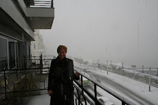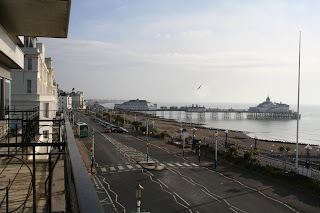 Yesterday was my parents' golden wedding anniversary and we travelled south to Sussex for the weekend. 50 years ago, they woke up on the morning of their wedding to an unexpected 4" of snow in South London. 50 years later, April brought them snow again, thankfully one day late as some of the guests might have missed the celebrations otherwise! And here's proof. The first picture was taken at 8am from our hotel balcony on Eastbourne seafront this morning - and the next one less than two hours later.