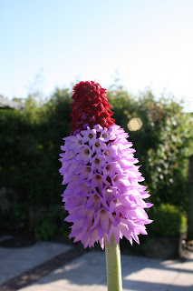 However we can't rely on chance recoveries so we are also keeping up the supply of new plants as well - this week's delivery to the nursery included Mathiasella Bupleuroides 'Green Dream', Colocasia 'Black Magic' and some more Papaver 'Patty's Plum'. But you'll have to wait for a few weeks as they are just babies and need to grow on a bit. One plant I brought with me (see the picture below) and immediately bought in a stock of way back in March is Primula vialli. Unlike most primulas this one can't stand winter wet - it rots the crown. But I think it's worth trying - I just love the way the flower spike slowly turns from red to purple as it opens up.