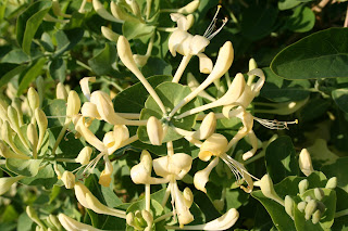 Lonicera caprifolia is unscented, but has the most beautiful form as new stems and creamy-white flowers emerge through the centre of the leaf below (perfoliate).