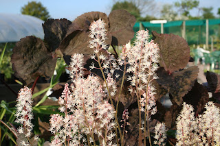 Talking of pink and chocolate contrasts, I've really taken to Tiarellas. This is Pink Bouquet and it looks fabulous against the bronzey, milk-chocolate leaves of Cryptotaenia japonica 'Atropururea'.