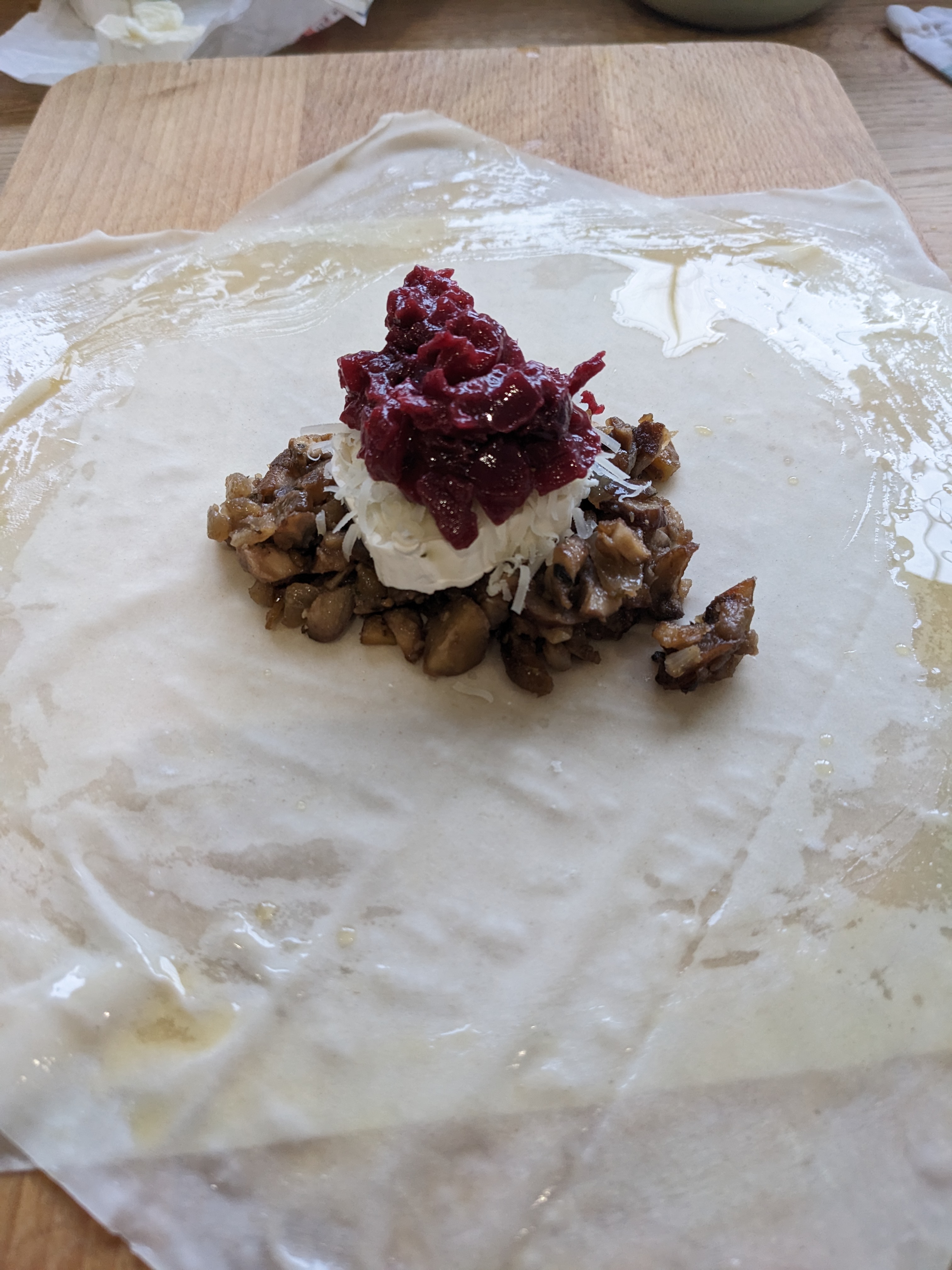 Put a spoonful of the mushroom mixture in the middle, pile some goats cheese on it and a spoon of cranberry sauce on top.