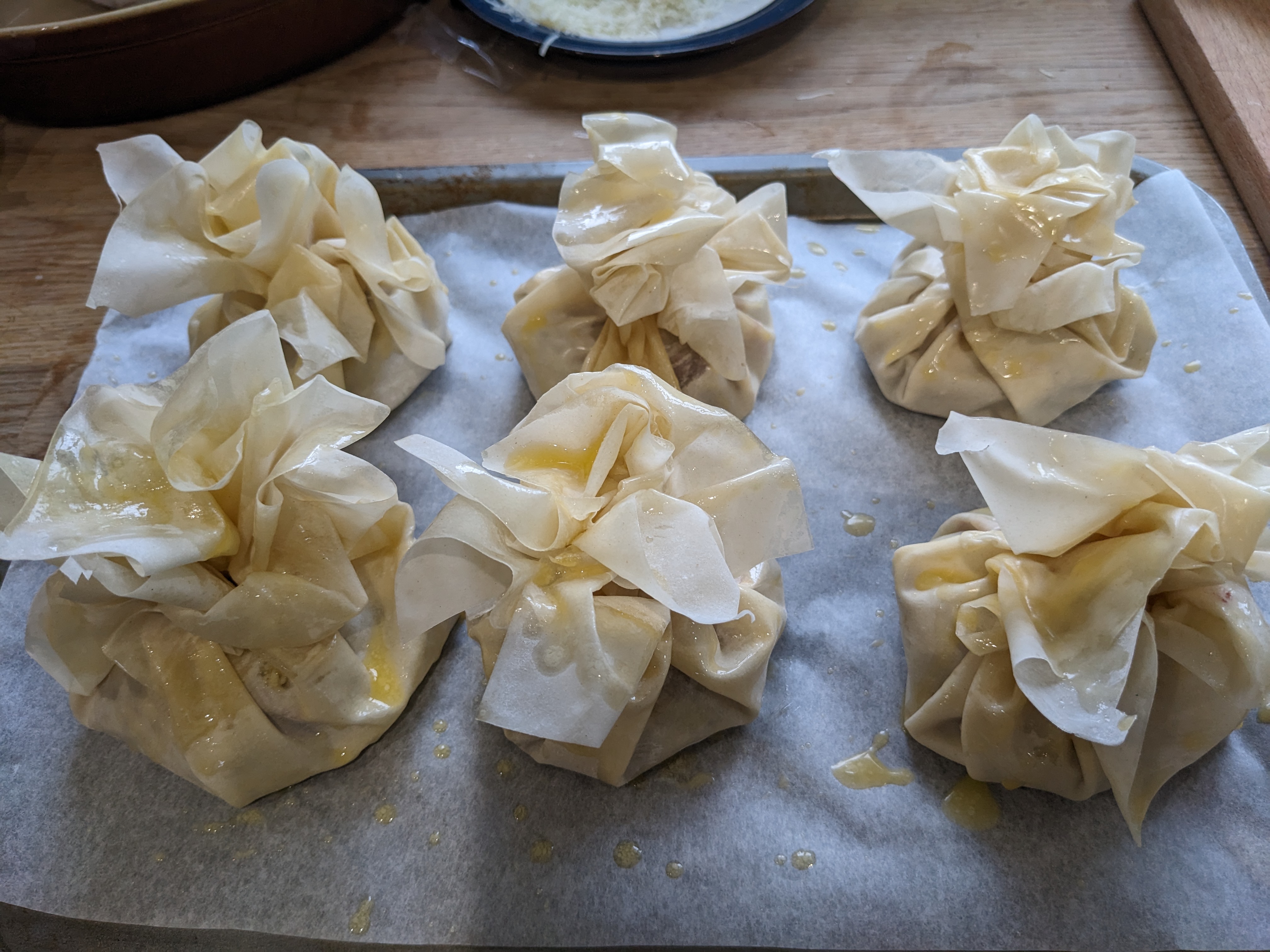 The vegetarians get the real treat though, a still-evolving festive adaptation of filo pastry parcels. Here's how to wow your guests, veggie or not. Be selfish, you need 6 foot of worktop all to yourself for the assembly stage.