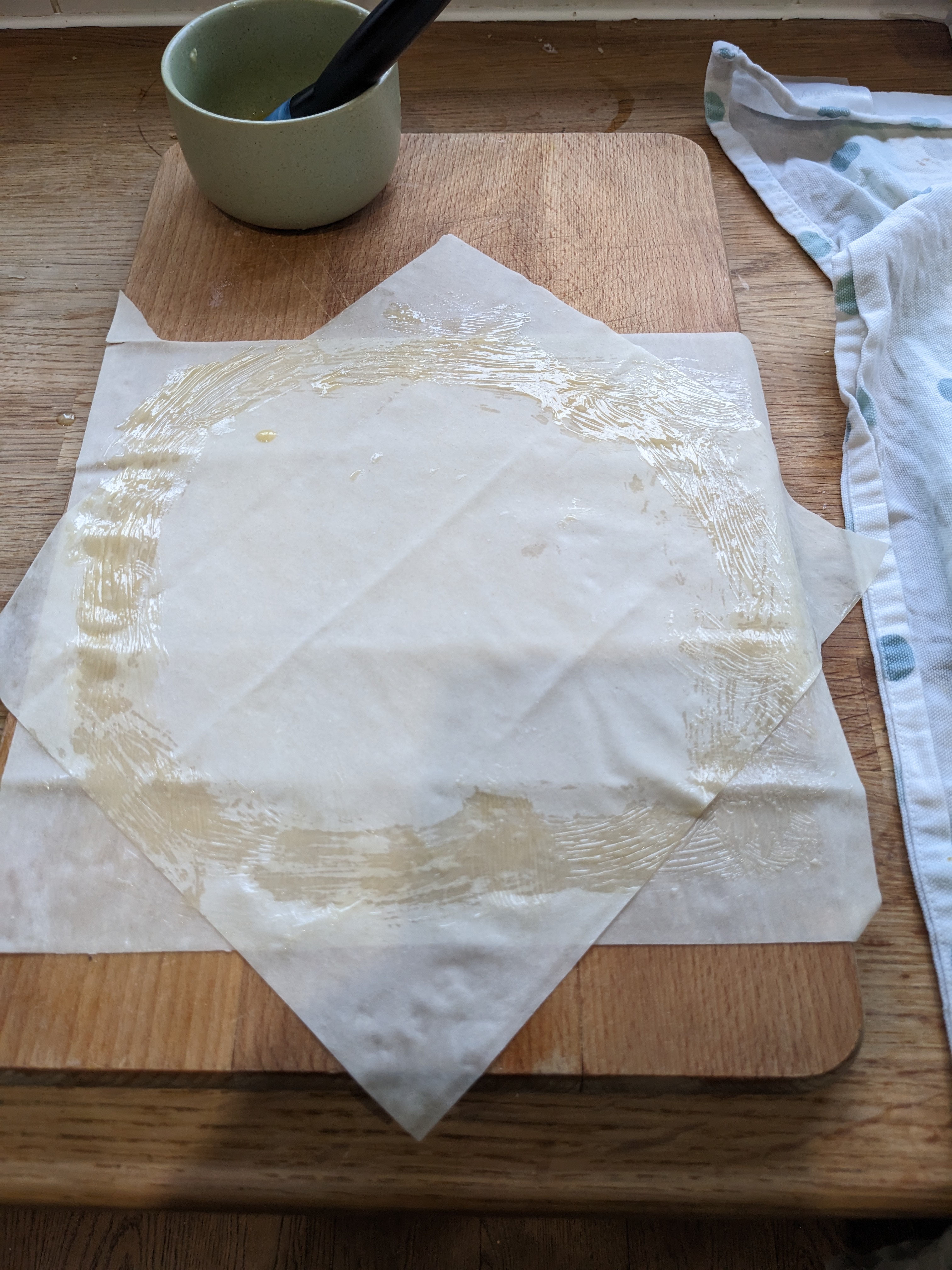 Take one sheet of filo pastry from under the damp tea towel, put it on the other board and cut it in half. Paint a large, rough circle of butter on one and put the other on top, offset. Paint a circle of butter on the top one too.
