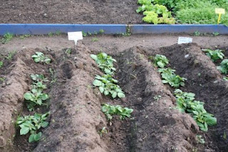 We've had a few raised eyebrows about our potato growing technique. You see, we've planted the tubers in the troughs, which looks a little unusual. There are two reasons for this - we figured the growing plants would get more water in the troughs as the rain would run in. And the mounds either side will be used to progressively earth up the potatoes as they grow, so by the time they are ready to harvest the plants will be on mounds, looking quite normal. I'll report back when we dig them up. Peter isn't impressed - he said we'll need a JCB to get them out...