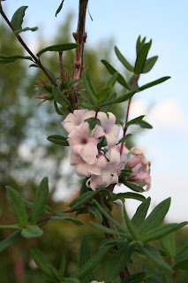 We think this is a Daphne, possibly Daphne cneorum. But I've also come up with Daphne tangutica Retusa Group. Here's a close up and a shot of the whole shrub. It is fabulously sweetly scented.