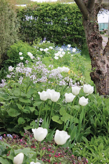 The spring border, just inside the garden entrance. It faces north and is backed by a conifer hedge (not Leylandii as it happens - Western Red Cedar or Thuja plicata. Better by miles..) I digress. The white tulip is 'Pax'. First time I've planted it and I love it. An absolutely pure white which glows in the low light levels here. The white flower at the same height is the perennial honesty, Lunaria rediviva.