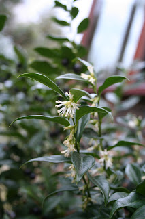 Sarcococca confusa or 'Christmas box'. A sweet, strong scent, capable of filling the area around a doorway. Slow growing and great in a pot.