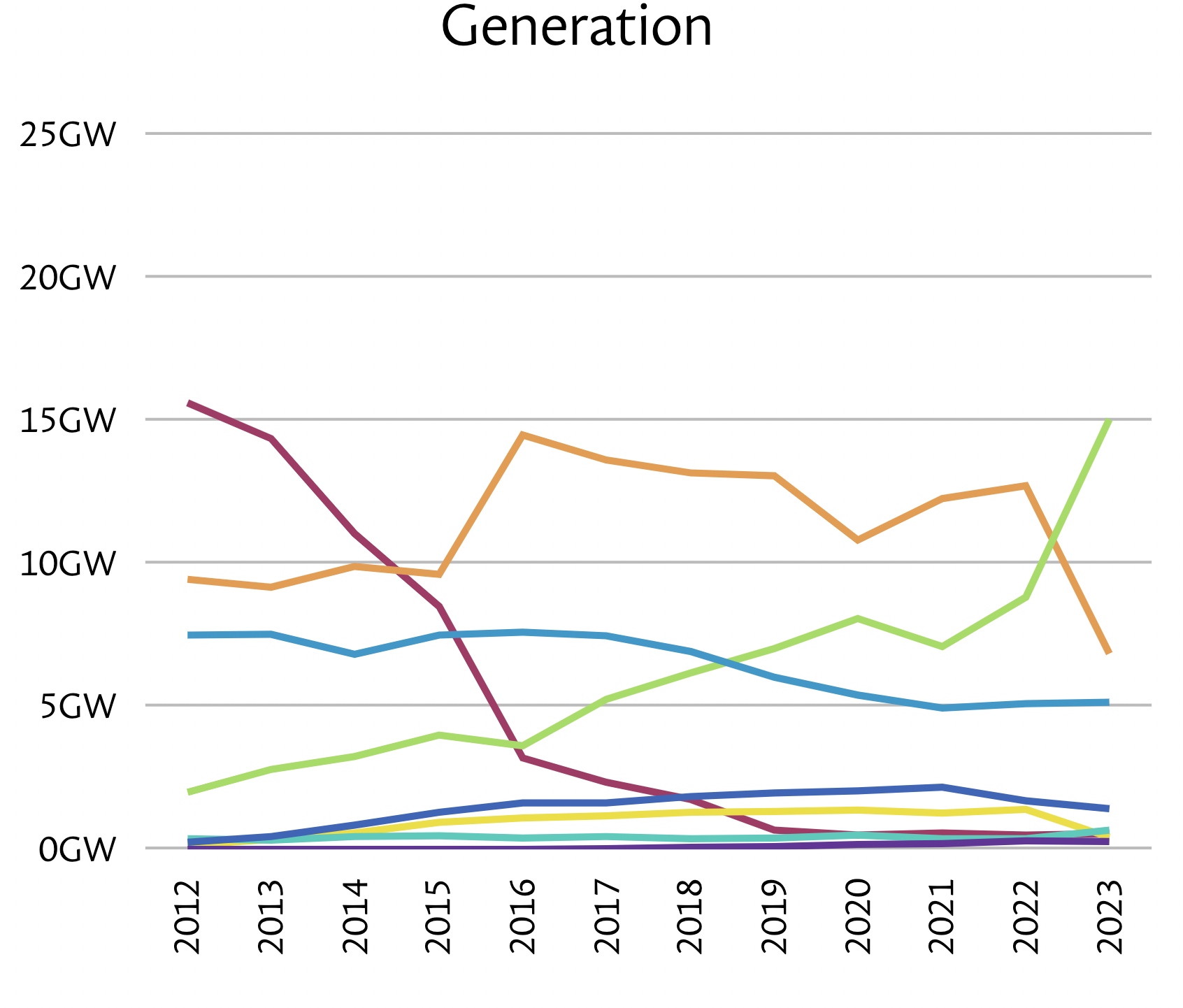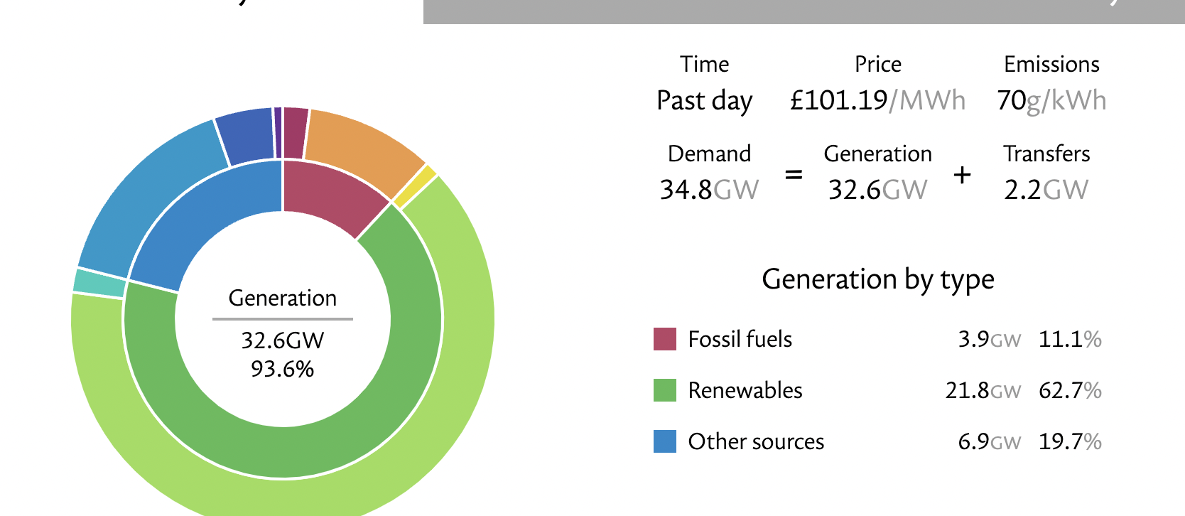 I forgot to copy the legend - red is coal, orange is gas, wind is green (of course!) and solar is yellow (ditto). Ignore the 2023 figures - we’ve only had three weeks of it so it’s skewed. The source is a superb site: National Grid Live Data . Quite addictive….