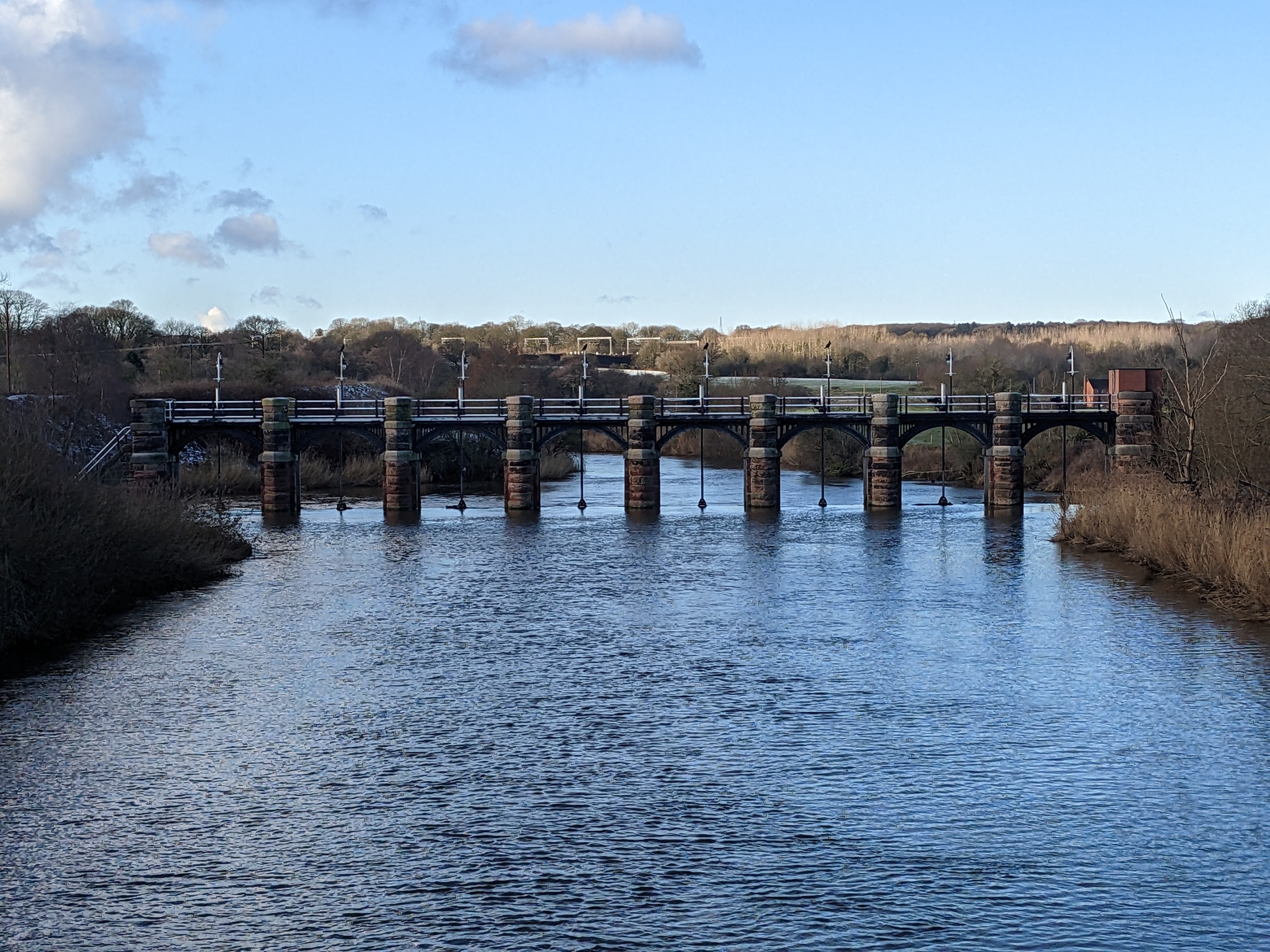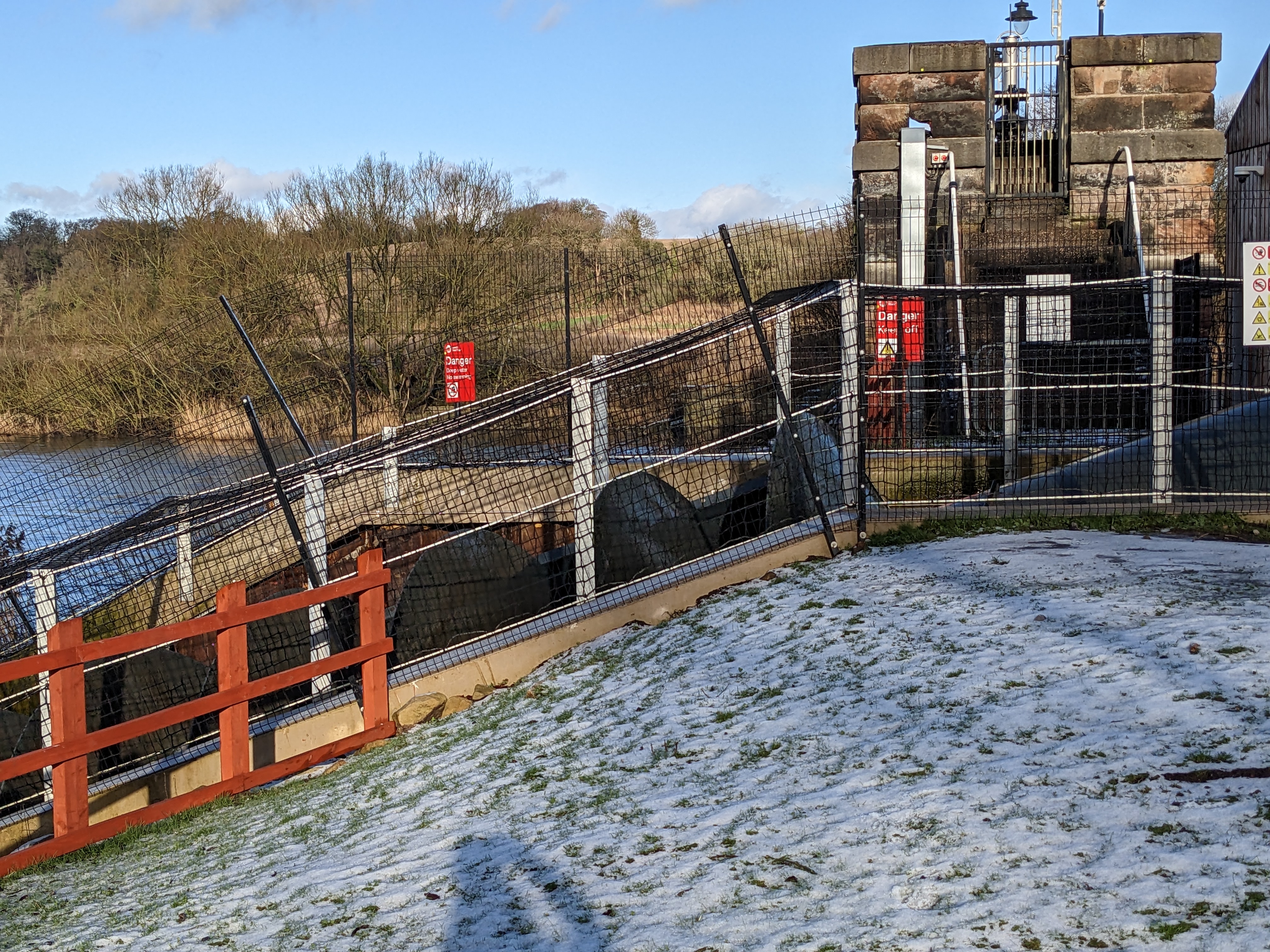 With no prospect of working, and no inclination to do so either, Steve and I bunked off for a couple of hours and walked our usual route down to the River Weaver. Tucked behind the cottages at Dutton Locks, a small revolution is happening - quite literally. A new hydro-electric plant has been installed alongside the weir. Frustratingly there is no live data feed but the original planning application suggests it’s a 200kW system. That’s per hour. Which works out at 1.75 million kWhrs a year, or enough to power around 400 homes. Can you see it in this picture? Nope - from the bridge the original weir looks exactly the same as before the plant was installed. But you might be able to spot four cormorants perched on top of the lights, if you zoom in.